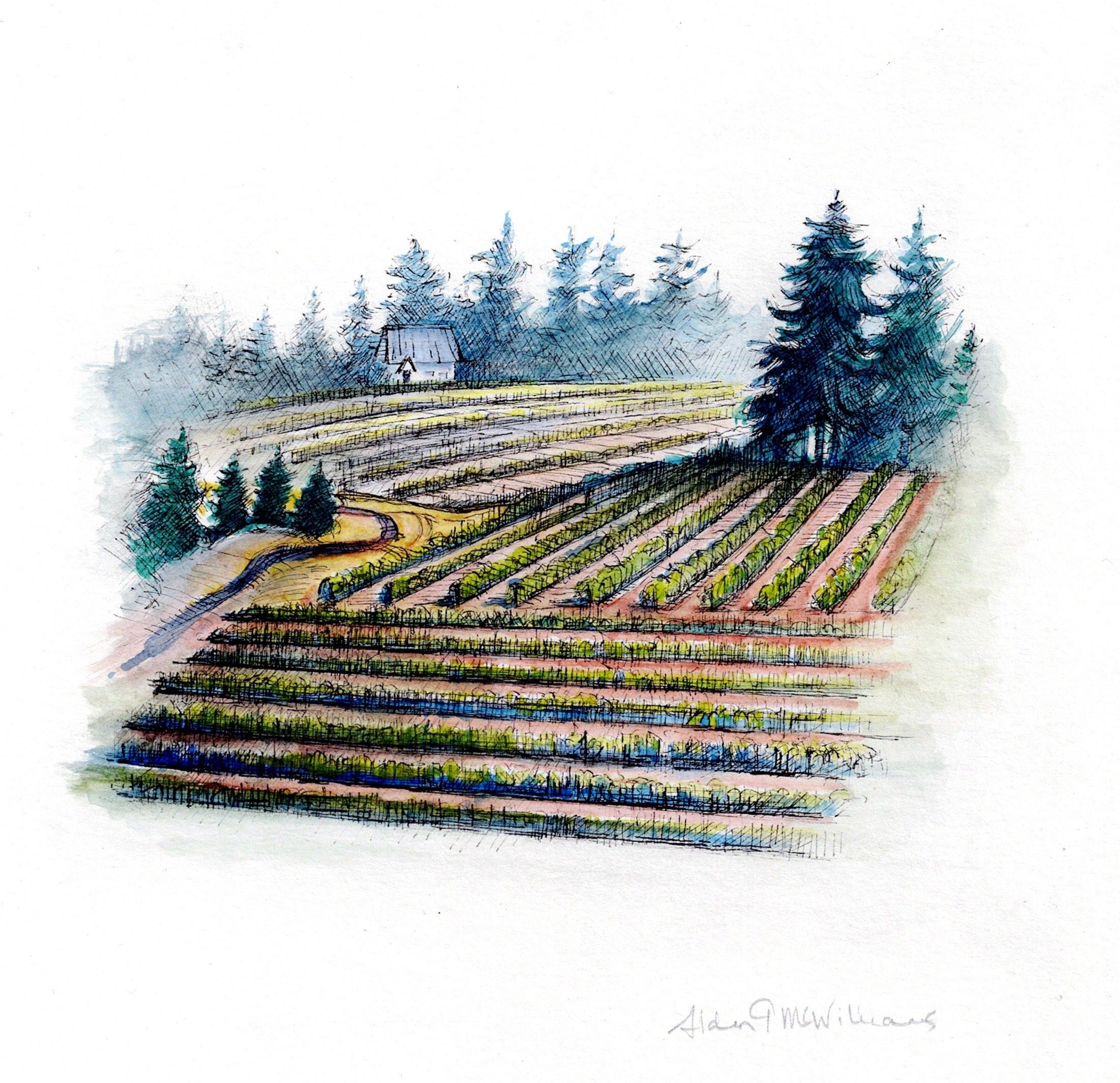 The B E A U X F R È R E S Vineyard / Ink and watercolor on paper / 12" x 9" / 2024 / Willamette Valley, Oregon / Available