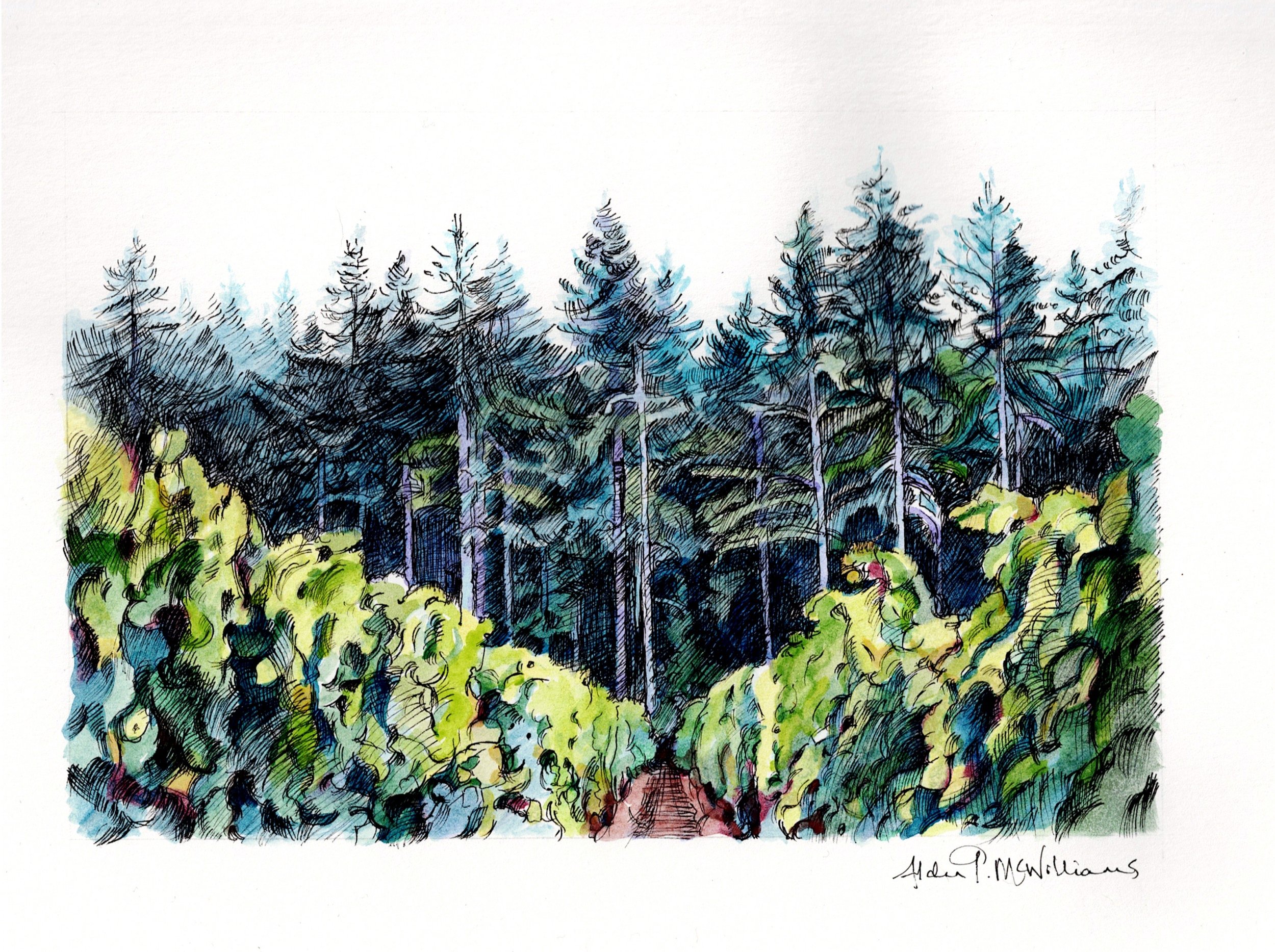 Upper Terrace Vineyard Pinot Noir 2023 - Label Art / Ink and watercolor on paper / 12" x 9" / 2024 / B E A U X F R È R E S Winery, Willamette Valley, Oregon / Commission