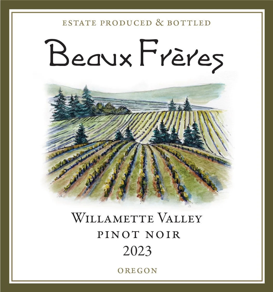 Willamette Valley Pinot Noir 2023 - Label Art / Ink and watercolor on paper / 9" x 12" / 2024 / B E A U X F R È R E S Vineyard, Willamette Valley, Oregon / Commission